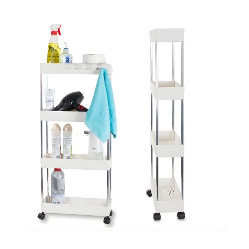 Ovaj višenamjenski organizator donosi maksimalnu funkcionalnost uz minimalnu zauzetost prostora. Njegov dizajn s četiri razine omogućuje vertikalno slaganje predmeta, dok kotačići omogućuju lako pomicanje čak i kada je polica puna. Zahvaljujući integriranim kukicama, imate dodatni prostor za vješanje ručnika ili pribora.