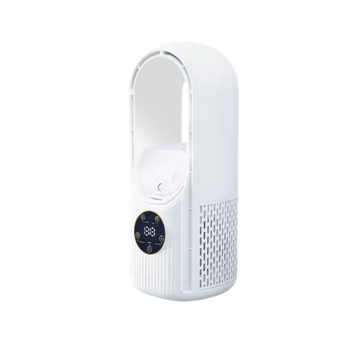 Stolni ventilator bez elisa s ovlaživačem i LED svjetlom je prijenosni stolni ventilator namijenjen osobnom osvježenju kod kuće, u uredu i na putu. Ovaj model posebno se koristi kada želiš ugodniji protok zraka na radnom stolu, noćnom ormariću ili u manjem prostoru bez velikog ventilatora. Stolni ventilator bez elisa je ventilator koji služi za osobno osvježenje i ugodniji osjećaj zraka, a koristi se na stolu, uz krevet ili u radnom prostoru.